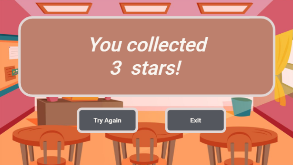 After feedback was given on the intial prototype, full development of the program was created. Some unique programming aspects of the experience are the stars that appear. Stars are collected if a learner answers a question correctly on the first time and are then displayed throughout the program. This means that strict variables and conditions needed to be set so that any combination of stars will appear correctly throughout the program. In the end of the program a unique variable and condition have been set to not only add up the number of stars that the learner was able to collect but take them to a specific slide based on that number.