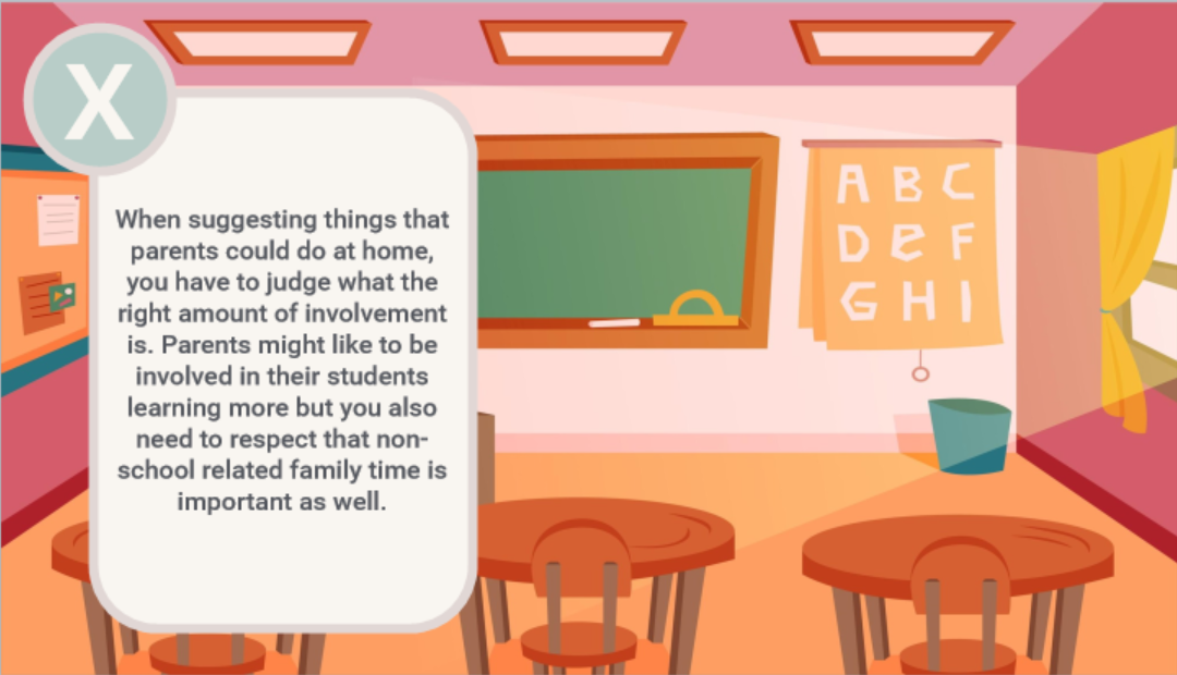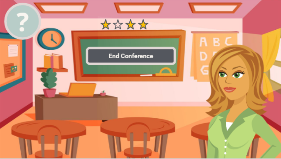 The solution I designed and developed focuses on a scenario based E-Learning experience. This type of solution allows learners to experience a parent teacher conference first hand while receiving feedback after each response whether it was the correct response or not. Learners are free to make mistakes in a safe and risk-free approach while engaging in a real-life scenario and practicing conference etiquette. As parent teacher contact is highly encouraged even outside of conferences, this will allow educators to use what they learned right away.