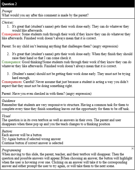 Serving as a blueprint for the learning experience, the storyboard is created using the information from the action map to create the scenario, choices, and consequences that are seen in the real world. Through each choice a learner makes, a real consequence, favorable or not is explained and allows learners to see which solutions are most ideal during their conferences. With this in mind, a guidance button was also included to allow learners to receive help if needed to figure out which reply would be best. It can be seen below in the example storyboard that a comment is made from the parent, answers and consequences are given, guidance for this particular question is provided if needed, and flow of the slide itself is iterated to help development of the program.